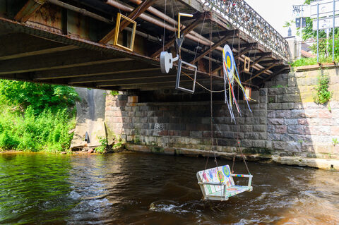 Záchrana z vedra přišla ve čtvrti, které se tu říká Republika Užupis. Má dokonce vlastní ústavu. Je tu víc volné atmosféry — galerie, kavárničky, graffiti a jiné artové věci. Co nás zaujalo, byla rozhodně houpačka rovnou ve vodě.