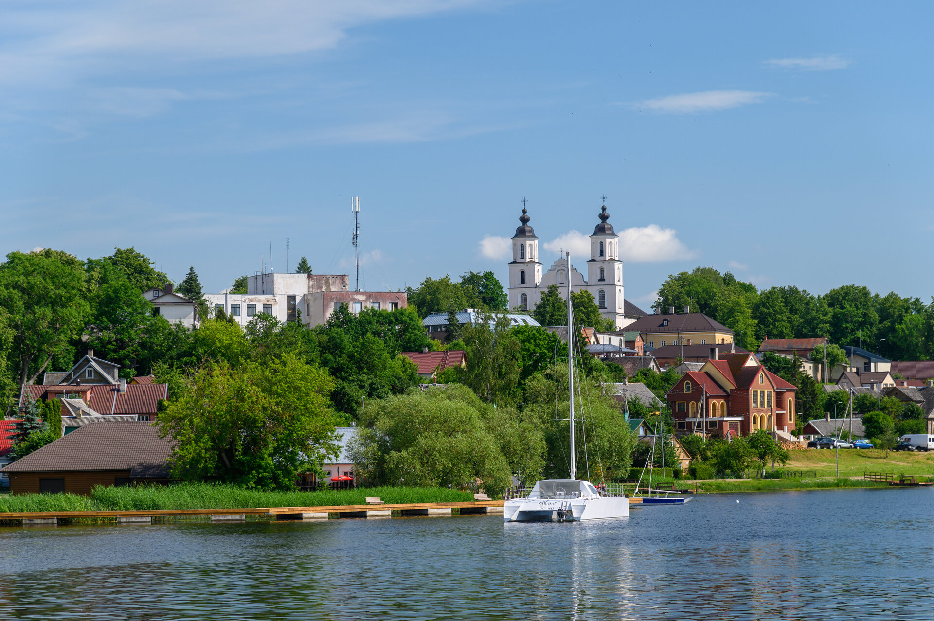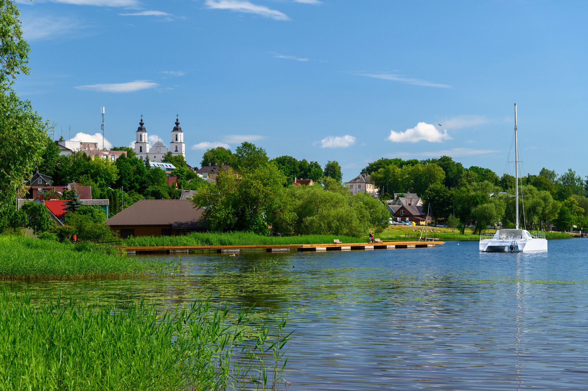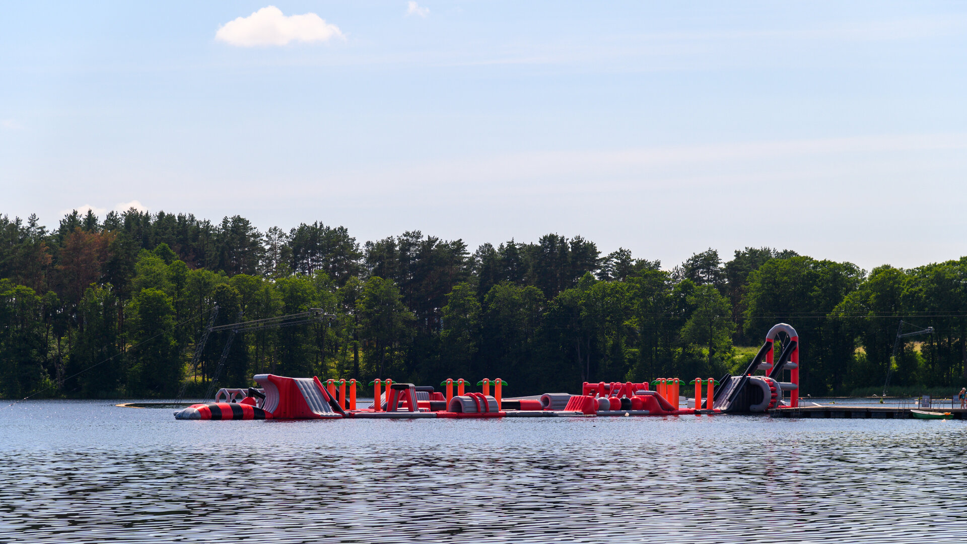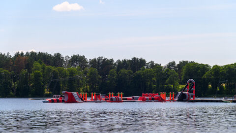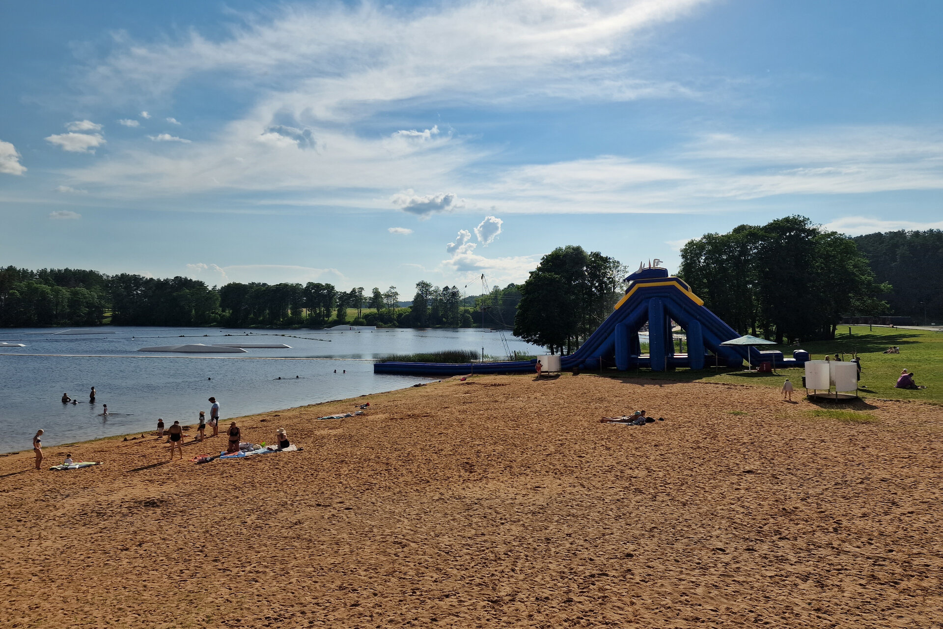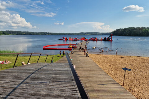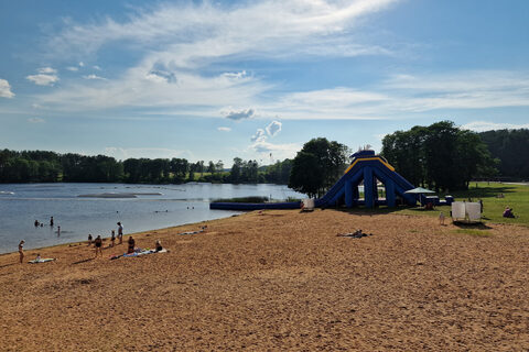 Tak jsme vyjeli směr Lotyšsko. Kousek před hranicí jsme uviděli vodní aquapark u jezera (Zarasų), a tak jsme se zastavili — osvěžení jsme potřebovali. Voda byla výborná, čistá, vodní skákací hrad za dvanáct eur na dítě. Kluci si zaskotačili, pak chvíli panikařili, když u atrakce zahlédli ve vodě hada.